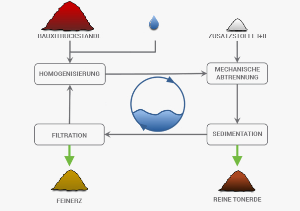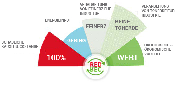 Beim Red Rec-Prozess werden die Partikel des Bauxitrückstands zunächst aufgelöst und mit einer Wasserschicht umhüllt. Anschließend werden die schweren Eisenfraktionen durch gestufte Sedimentation entfernt. Die verbleibende Suspension wird gefiltert, um Veredelungslehm zu gewinnen, und das Prozesswasser wird wieder an den Anfang des Verfahrens zurückgeführt.