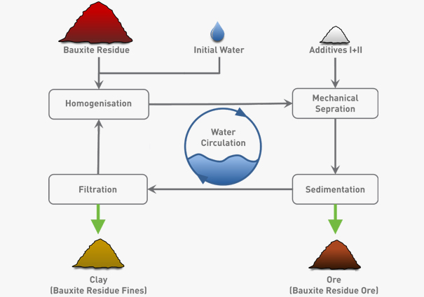 The Red Rec process first disperses the bauxite residue particles and builds up hydration shells around the particles to then use fractioned sedimentation to remove iron heavy fractions. The suspension is filtered to receive refining clay and the process water is returned to the start of the process.